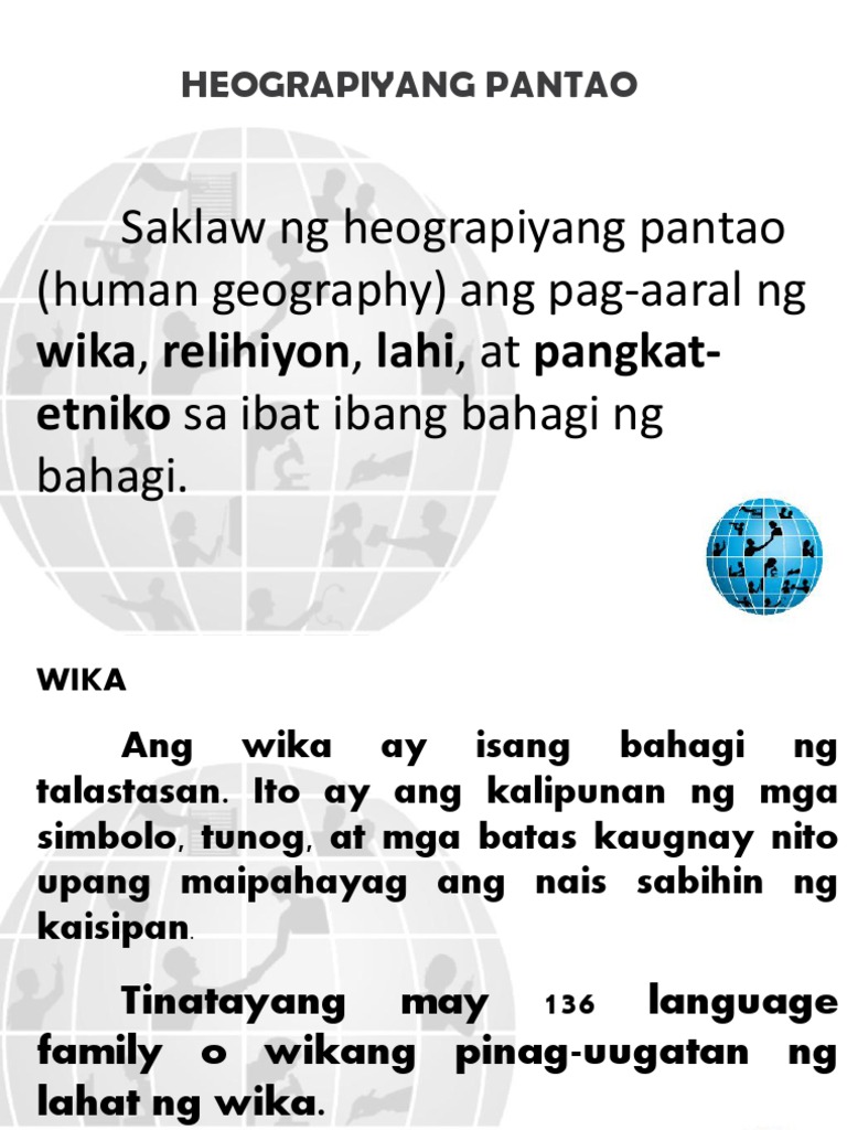 Saklaw ng Heograpiyang pantao human heography pag-aaral ng wika relihiyon lahi at pangkat-etniko sa ibat ibang bahagi ng daigdig. Click again to see term. Hindi tulad ng lahi maaaring baguhin ng isa ang etniko.