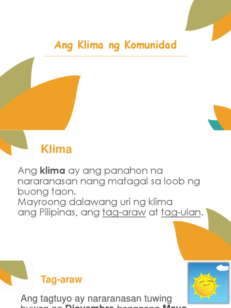 A halos walang tuyong panahon b maikli lamang ang tuyong panahon c pareho ang haba ng tag-ulan at tag-araw 2. Grade 2 PPT_Araling Panlipunan_File 6pptx. Translation from Tagalog to English.